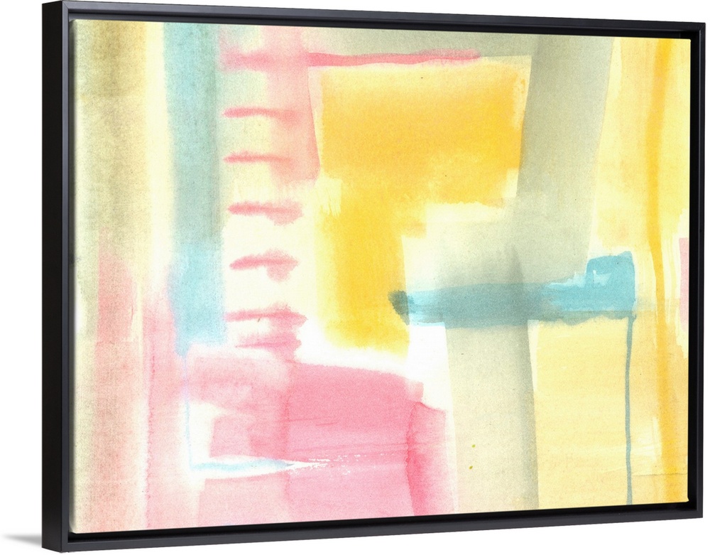 <p>Pastel abstract watercolor artwork in blended shapes of pink, grey, teal, and yellow.</p>