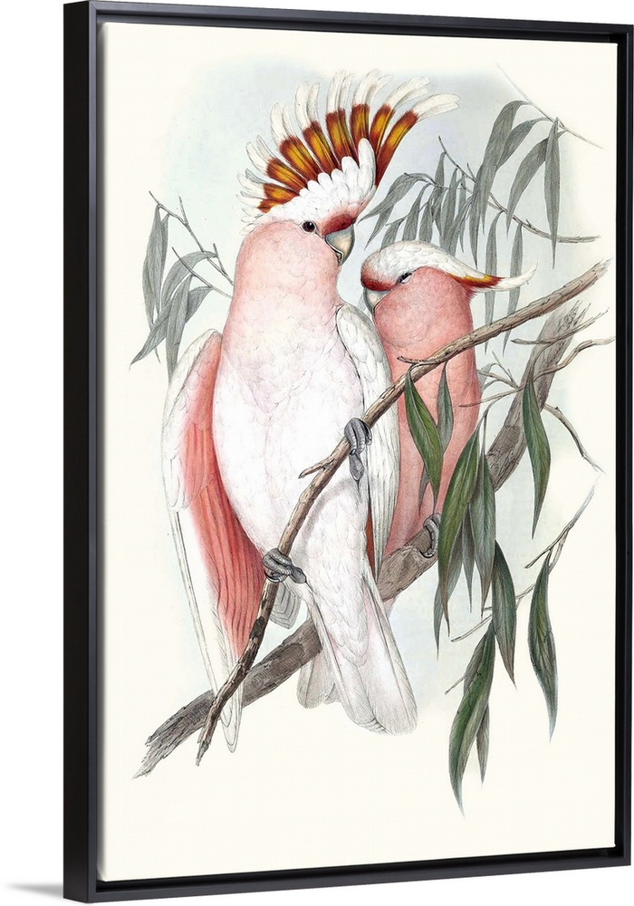 <p>Decorative artwork of tropical parrots perched on branches in pastel tones.</p>