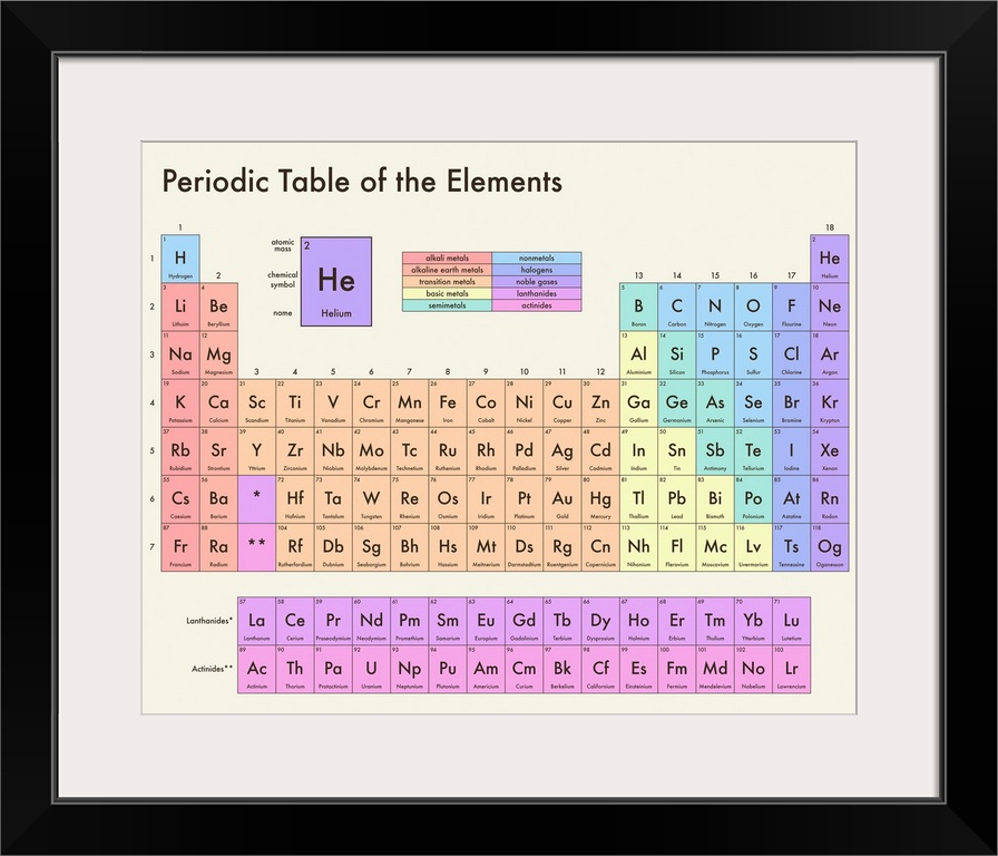 <p>Pastel colored Periodic Table of the Elements, on a light background with modern sans-serif text.</p>