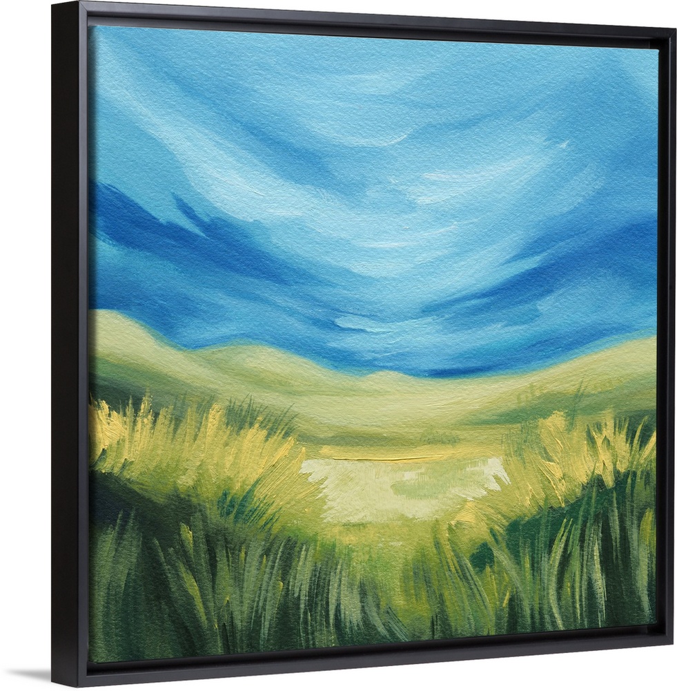 <p>A contemporary abstracted landscape painting on tall grasses in front of rolling hills under a deep blue sky. Fluid brushstrokes give a sense of movement to the image</p>