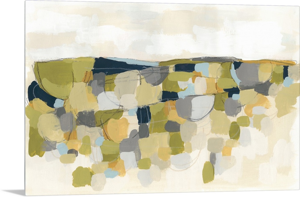 <p>This contemporary artwork features blocks of yellow, green and blue over a beige landscape.</p>