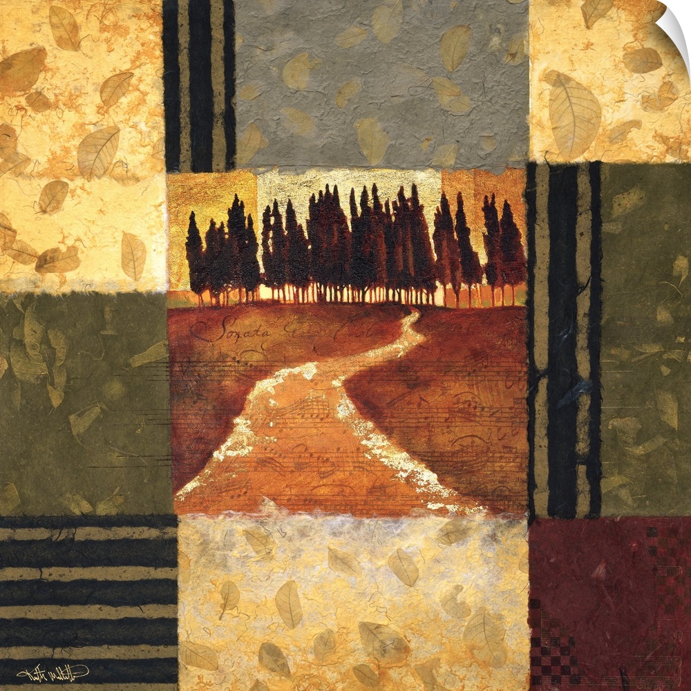 <p>Square artwork of a landscape featuring a path leading to a row of trees surrounded by a multi-colored square border.</p>