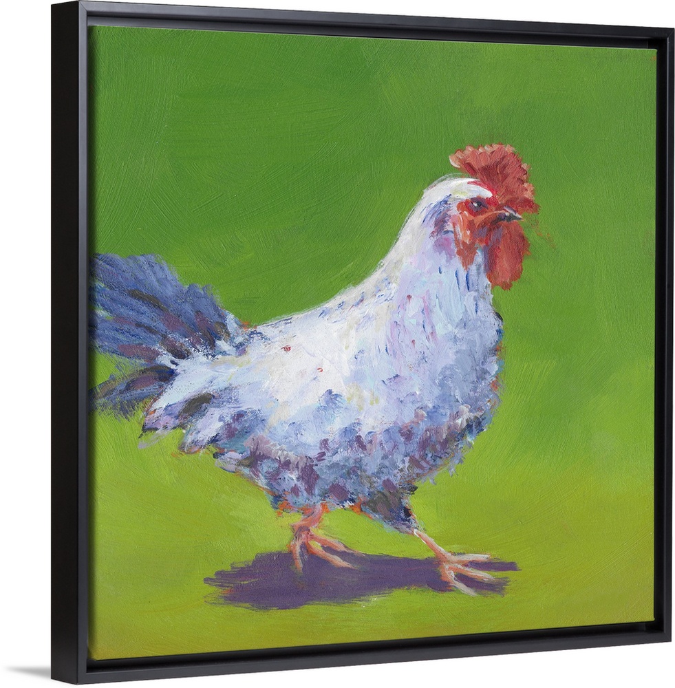 <p>Contemporary artwork of a chicken trekking through a pasture.</p>