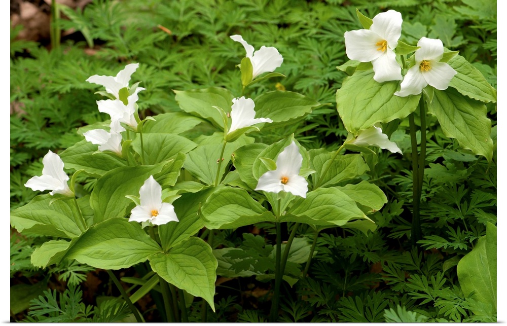 <p>Patch of flowering white trillium, Trillium grandiflorum, in spring.</p>