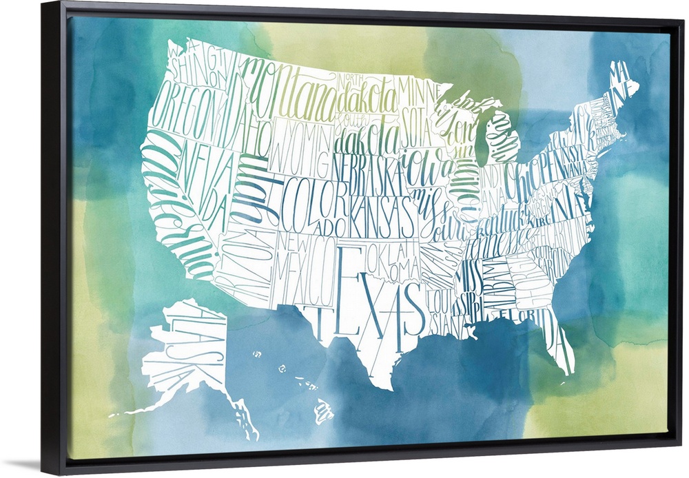 Art Office Art Blue Wall Art Decorative Art Maps Maps by Country United States Maps Painting Grace Popp Typography & Calligraphy Watercolor