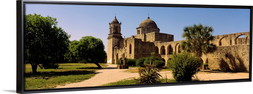 <p>Panoramic photograph of a brick path leading toward the historic Mission San Jose, surrounding by green grass and foliage in San Antonio, Texas.</p>