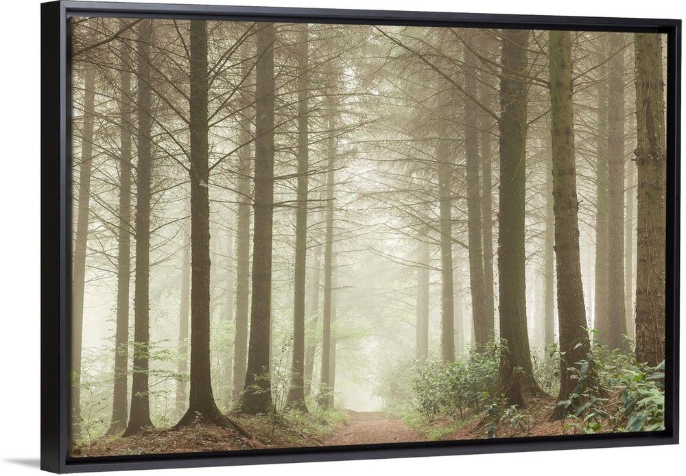 <p>Path leading through a misty coniferous woodland, Devon, England.</p>