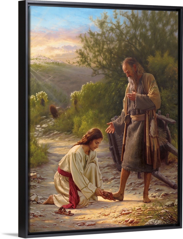 <p>Religious art of Jesus helping a man put on his shoes with a sunset in the background.</p>