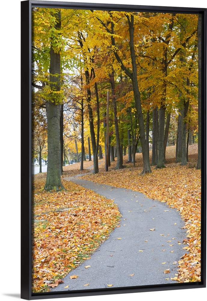 <p>A large vertical piece of a path winding through trees during the autumn with leaves covering the ground beside it.</p>