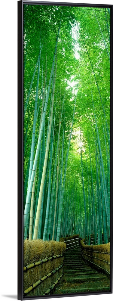 <p>Vertical photograph of steps in a landscaped bamboo garden.</p>