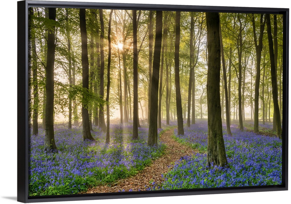 <p>Path Through Bluebell (Hyacinthoides non-scripta) Wood in Mist, Hertfordshire, England</p>