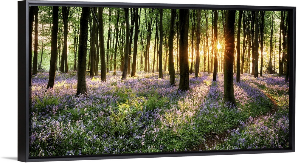 <p>Path through bluebell woods in early morning sunrise.</p>
