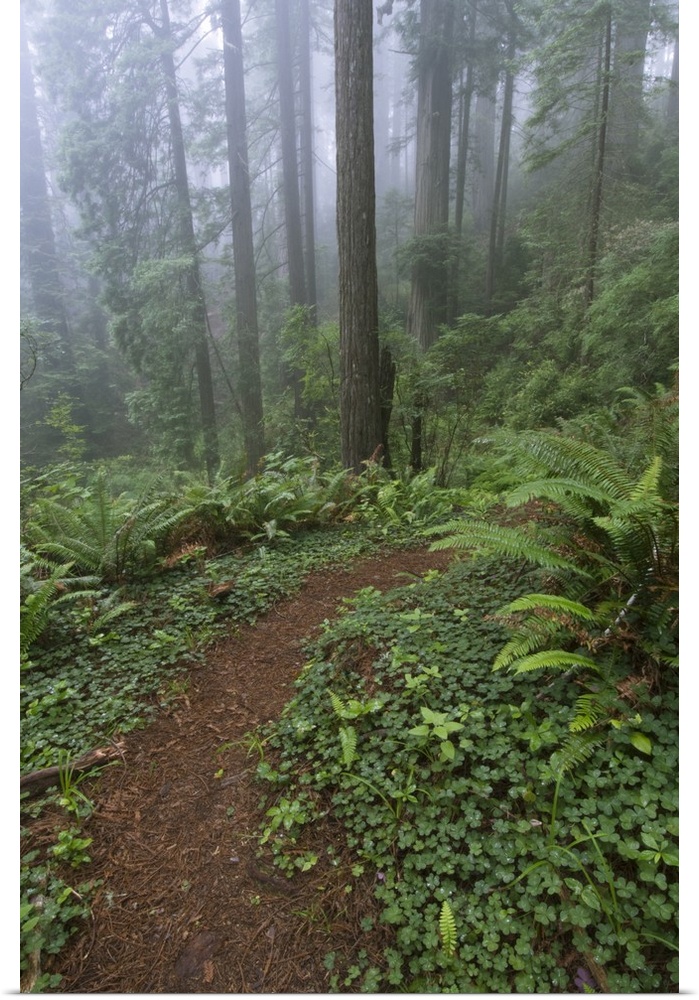 <p>Path through the giant redwood trees shrouded in fog, Redwood National Park, California, USA.</p>