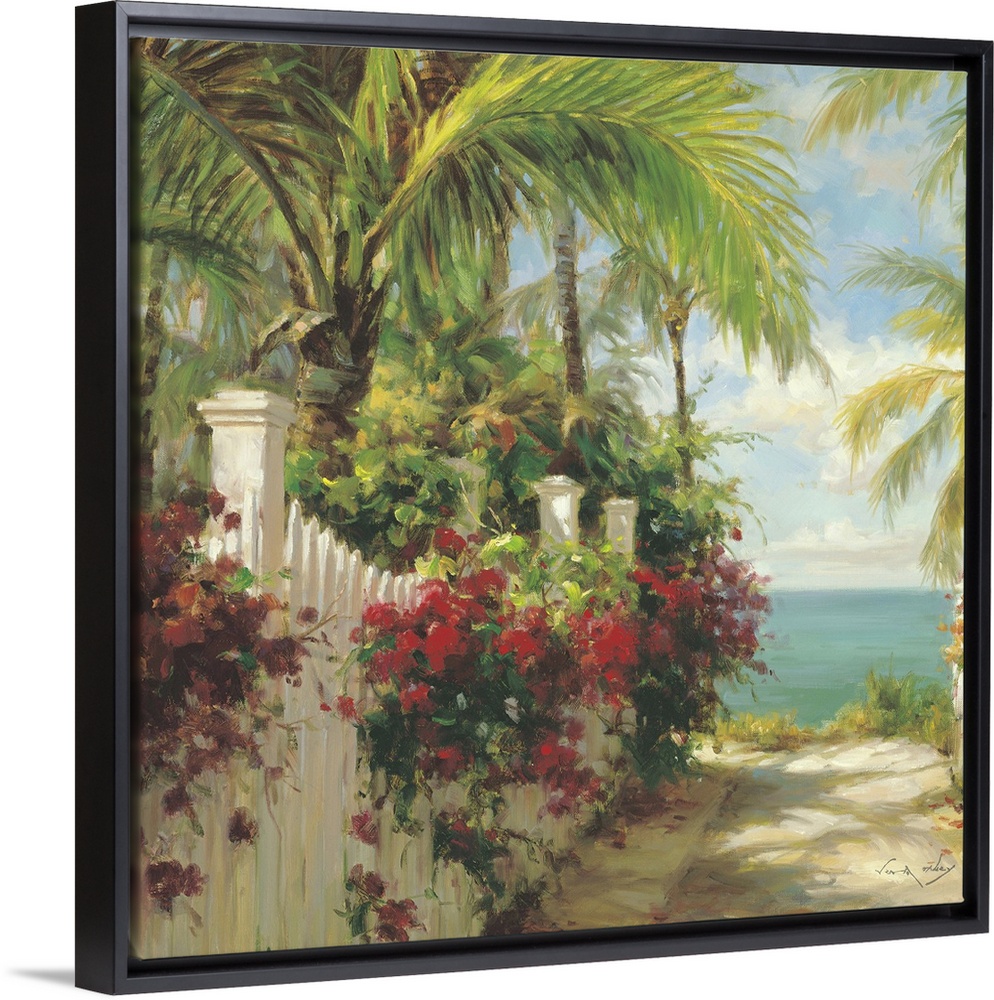 <p>Contemporary painting of a sandy path to the ocean with white fences and palm trees.</p>