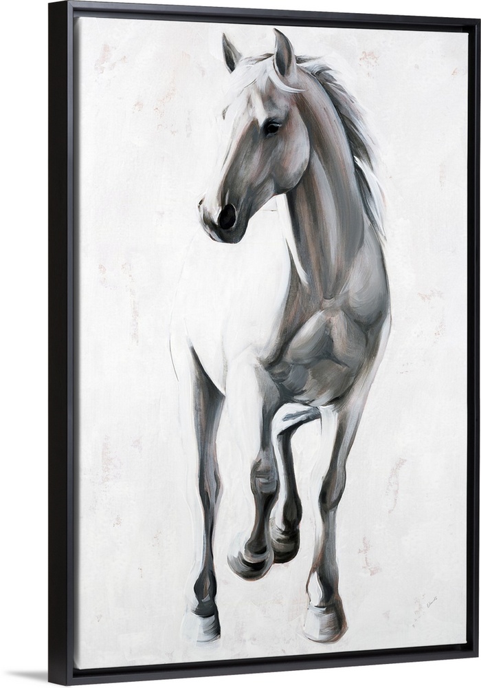 <p>Contemporary painting of a horse with 2 legs up in black and white with brown highlights.</p>