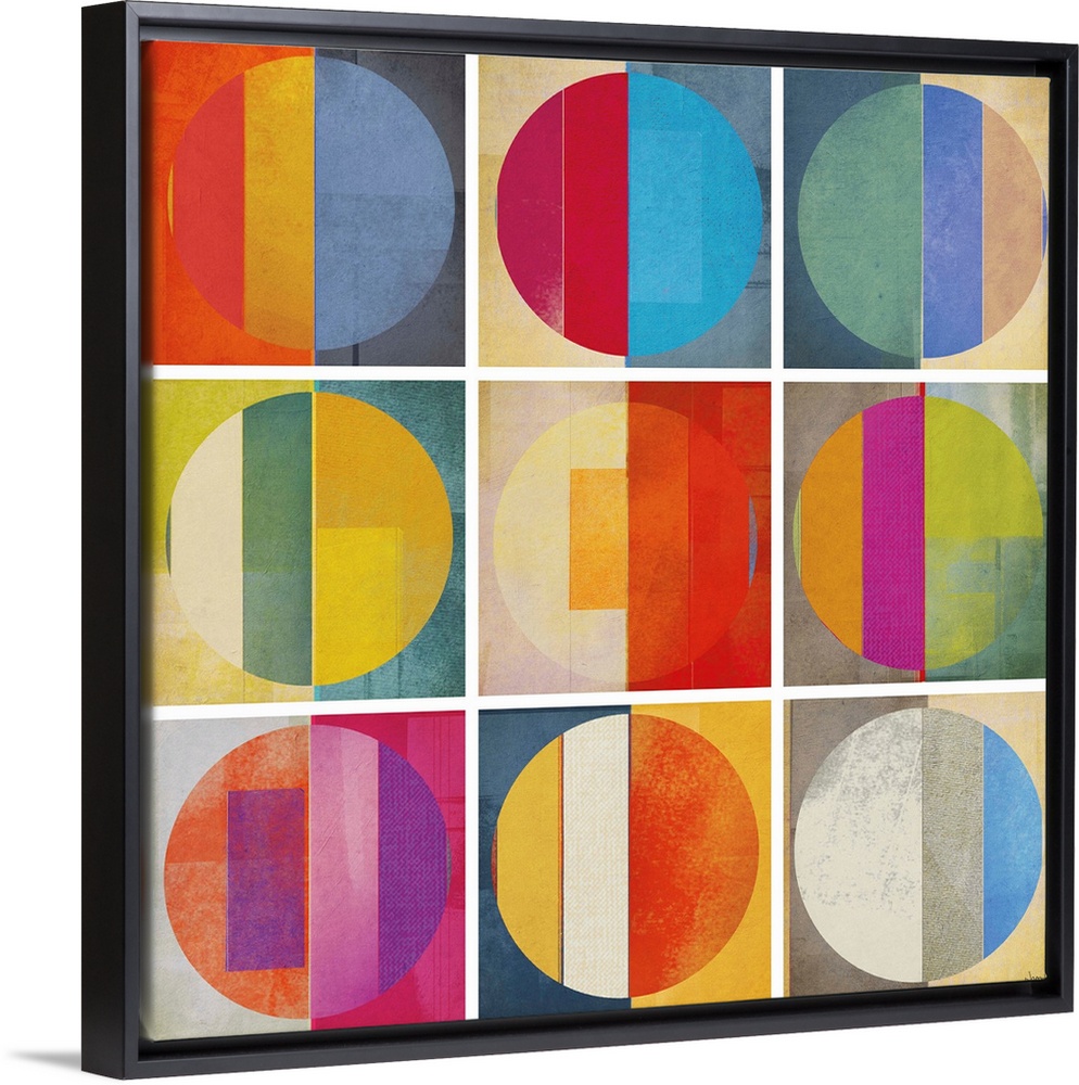 <p>A square abstract of rows of multi-colored circles within boxes divided by white lines.</p>