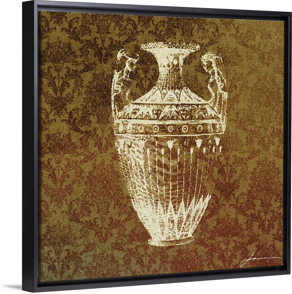 <p>Stenciled antique vase against a vintage pattern.</p>