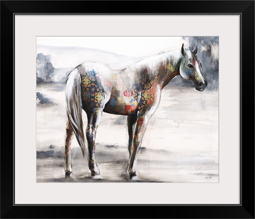 <p>Contemporary artwork of a horse in a field created with colorful patterns made with mixed media.</p>