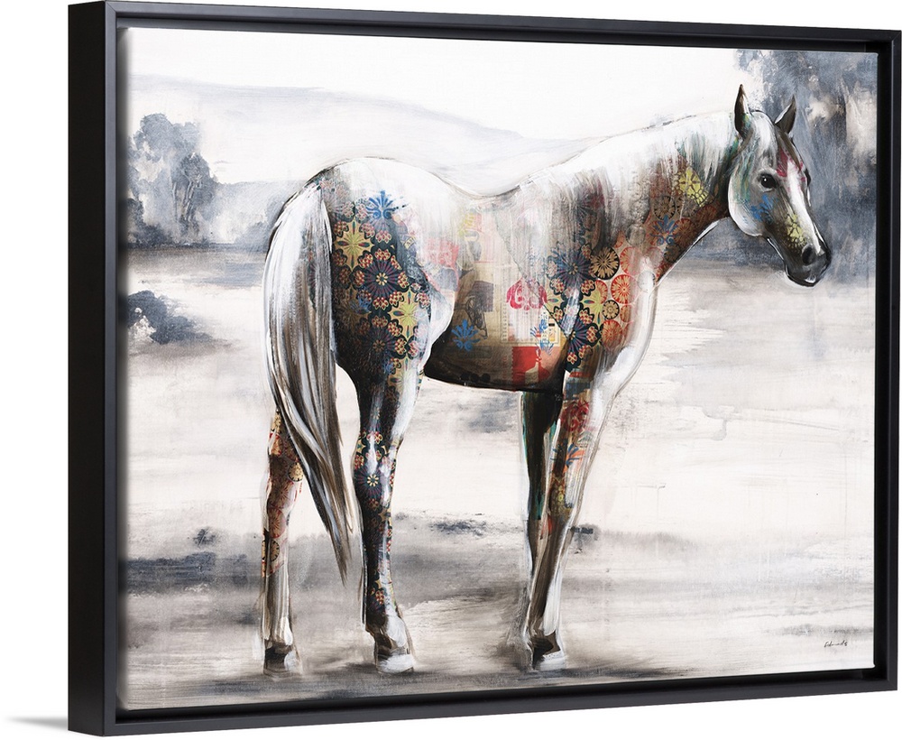 <p>Contemporary artwork of a horse in a field created with colorful patterns made with mixed media.</p>