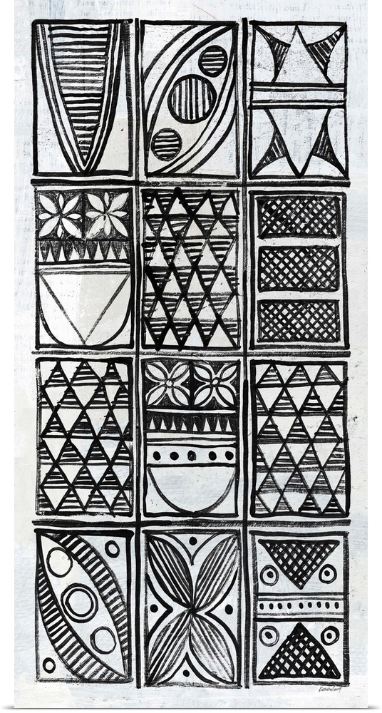 <p>Black and white painting with neatly stacked rectangles filled with different intricate designs.</p>