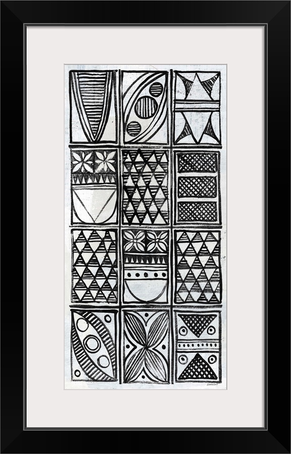 <p>Black and white painting with neatly stacked rectangles filled with different intricate designs.</p>