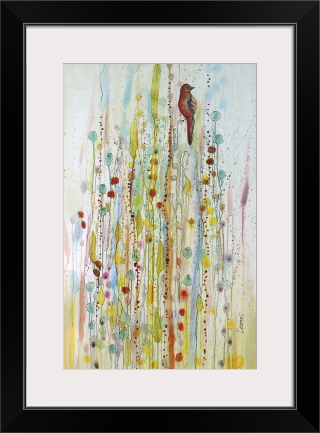 <p>Colorful contemporary watercolor painting of a bird perched on a branch against a colorful background.</p>