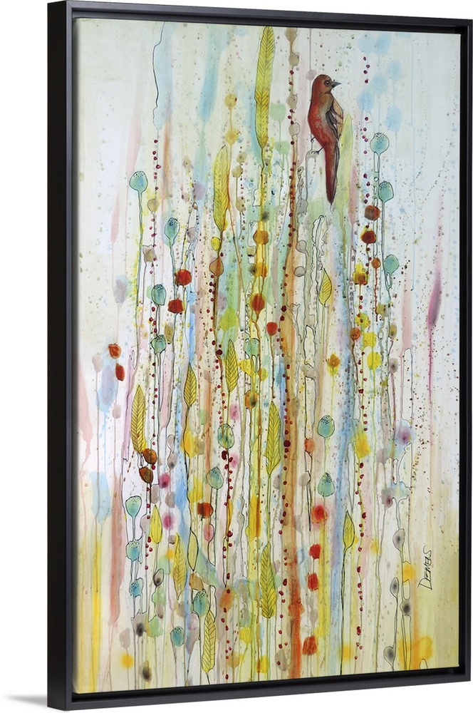 <p>Colorful contemporary watercolor painting of a bird perched on a branch against a colorful background.</p>