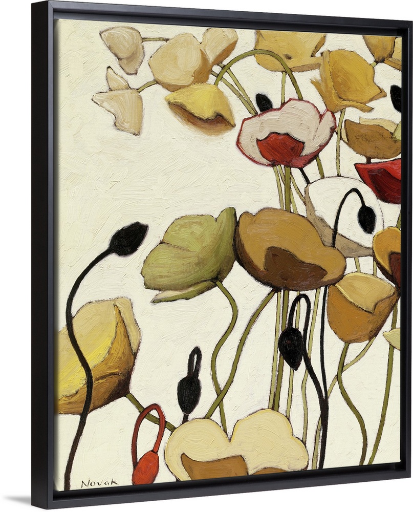 <p>Vertical, big floral painting of poppy flowers with minimal detail, extending upward on long stems, in mainly golden tones on a light background. Painted with thick, directional brushstrokes.</p>