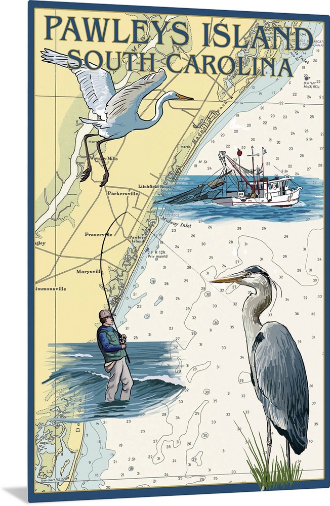 <p>Retro stylized art poster of a map with a blue heron, a fisherman and a fishing boat.</p>