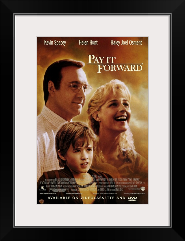 <p>Seventh-grade student Trevor (Osment) takes his social studies assignment very seriously. His teacher Eugene (Spacey) has his students think of an idea to change the world and tells them to put it into action. Trevor comes up with the idea of doing a good deed for someone who is then supposed to do a favor for someone else as a way to pay the favor forward. Trevor's cocktail waitress/recovering alcoholic mom Arlene (Hunt) finds herself wary of both the project and the teacher. Trevor, however, has decided to use the two of them as his first pay it forward subjects. Cloyingly emotional and more than a little manipulative. Based on the novel by Catherine Ryan Hyde.</p>