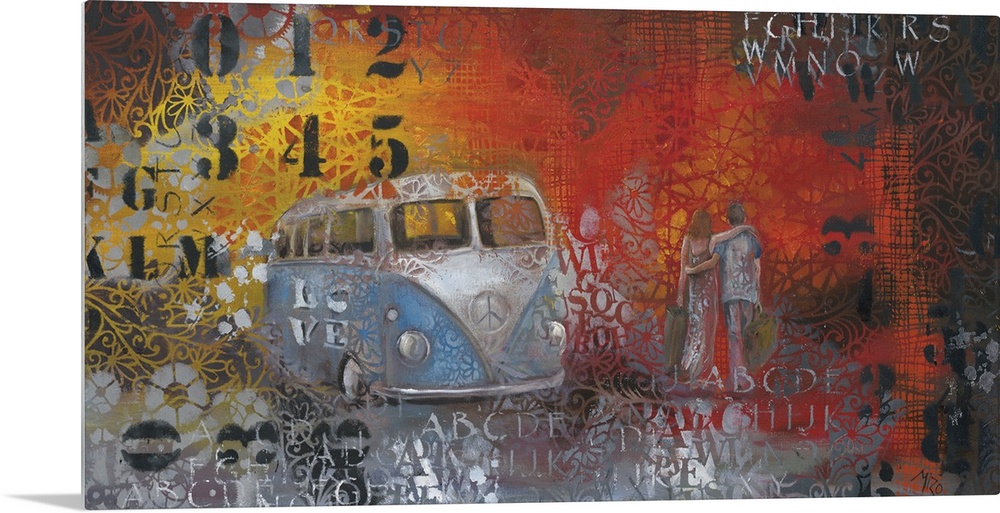 <p>Painting of a blue Volkswagen bus embellished with paint splatters and stenciled numbers.</p>
