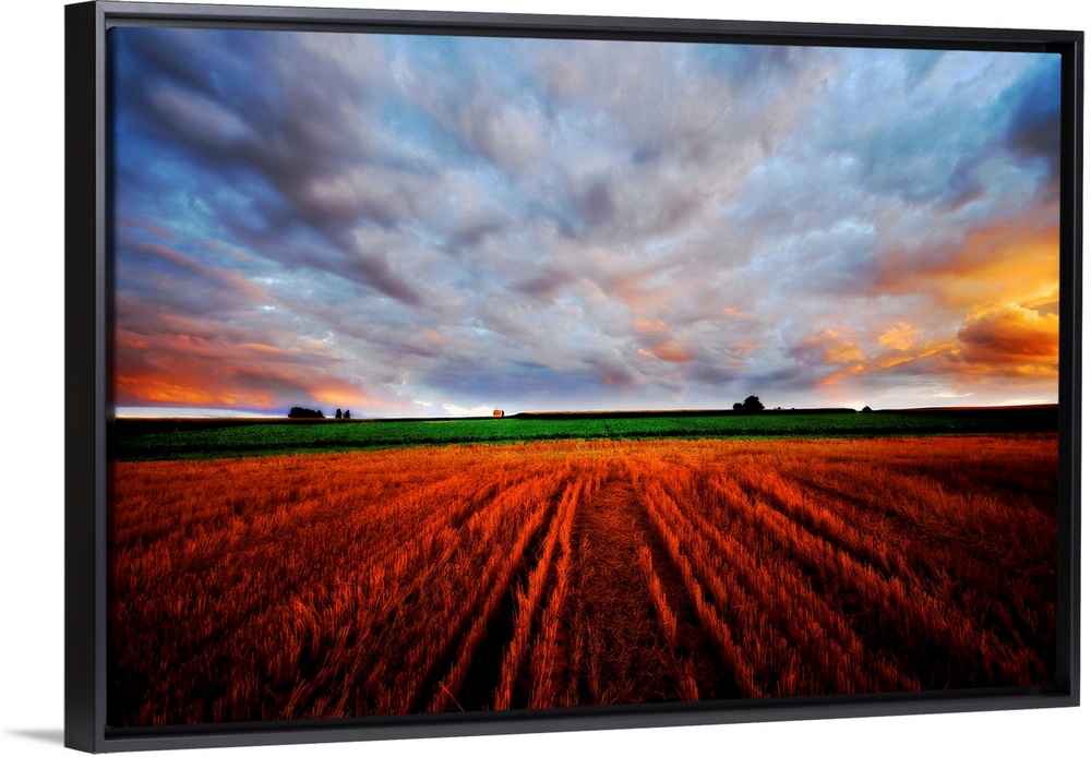 <p>In this expansive photograph a farmer's field is shown stretching into the skyline under a cloudy and colorful sunset.</p>