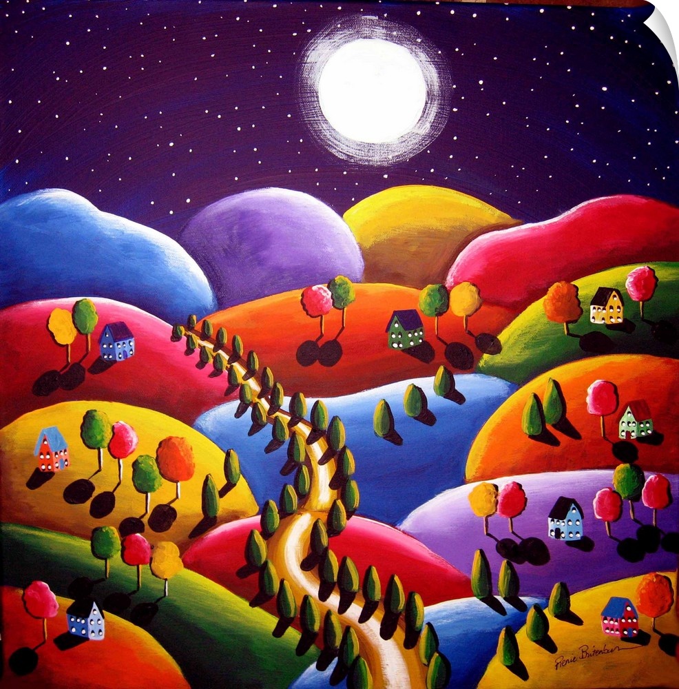 <p>This is a lovely scene with whimsical houses and trees, with the houses done in bright colors on colorful hills. They are under a full moon.</p>