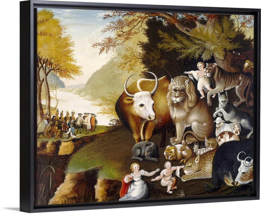 <p>Peaceable Kingdom, by Edward Hicks, c. 1834, American painting, oil on canvas. Hicks painted 62 versions of this work, featuring animals, predator and prey, at peace and eating straw. The scene is based on Chapter 11.6 of Isaiah, 'wolf also shall dwell wi</p>