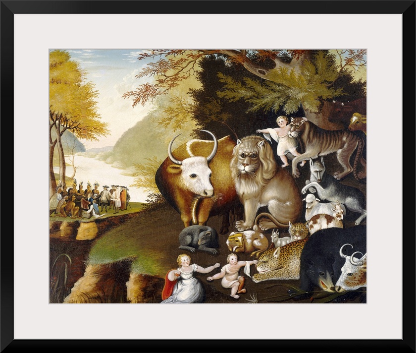 <p>Peaceable Kingdom, by Edward Hicks, c. 1834, American painting, oil on canvas. Hicks painted 62 versions of this work, featuring animals, predator and prey, at peace and eating straw. The scene is based on Chapter 11.6 of Isaiah, 'wolf also shall dwell wi</p>