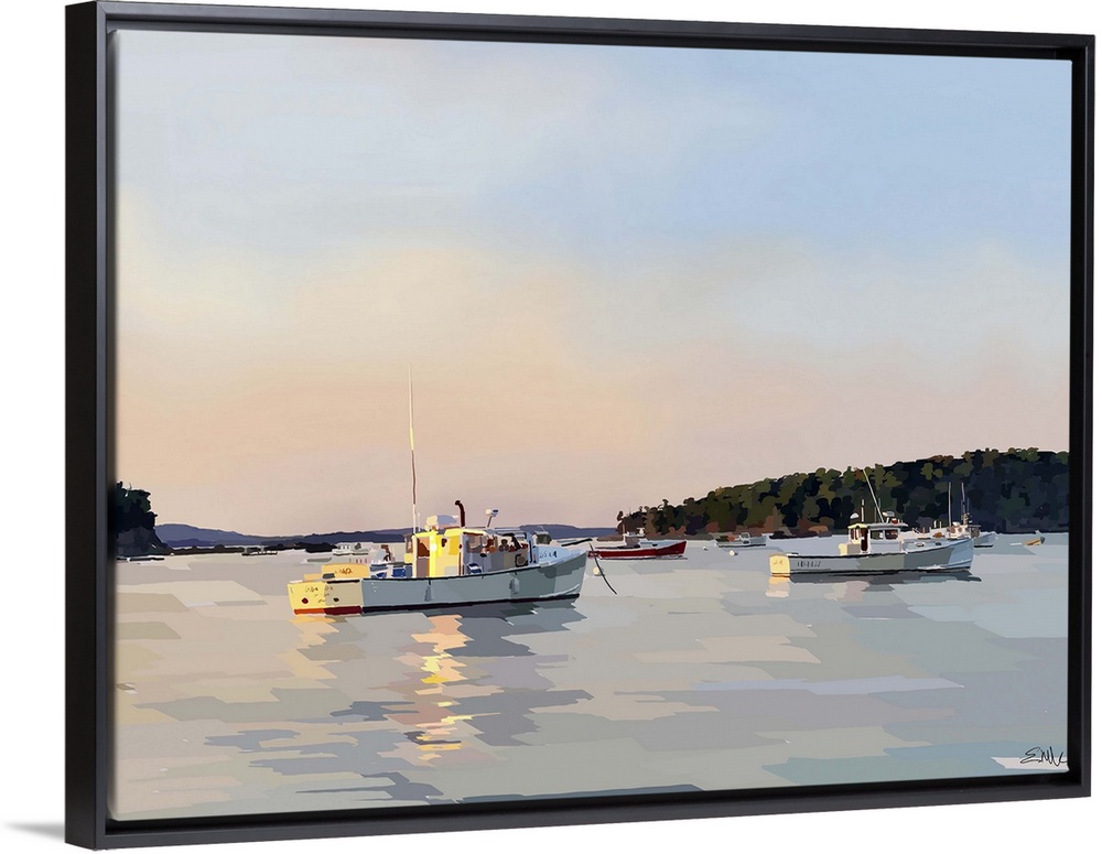 <p>Serene seascape painting of fishing boats on the water at sunset.</p>