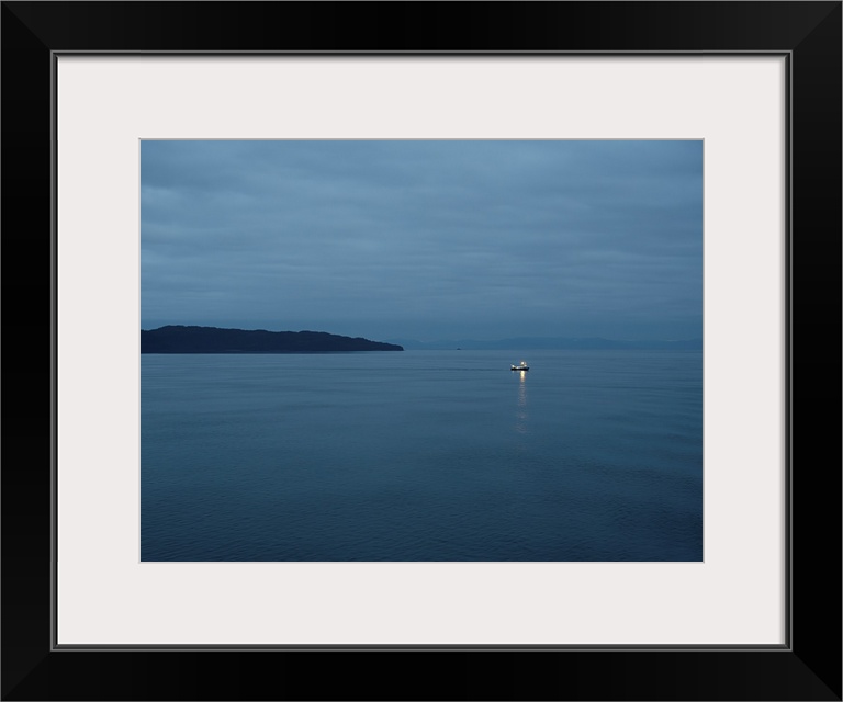 <p>In the twilight of evening a tiny fishing vessel, its lights shining and reflecting on the quiet waters, makes its way across the vastness of this beautiful Alaskan bay.</p>