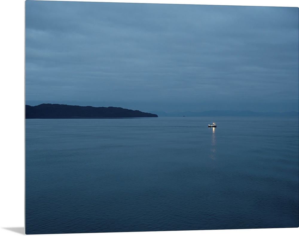 <p>In the twilight of evening a tiny fishing vessel, its lights shining and reflecting on the quiet waters, makes its way across the vastness of this beautiful Alaskan bay.</p>