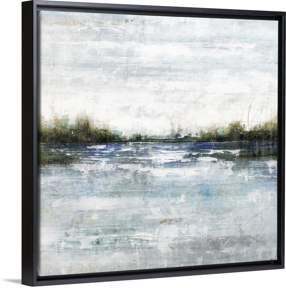 <p>Square landscape painting of a body of water with low vegetation surrounding it in the background.</p>