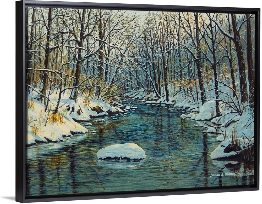 <p>Contemporary artwork of a winter forest scene with a river running through it</p>