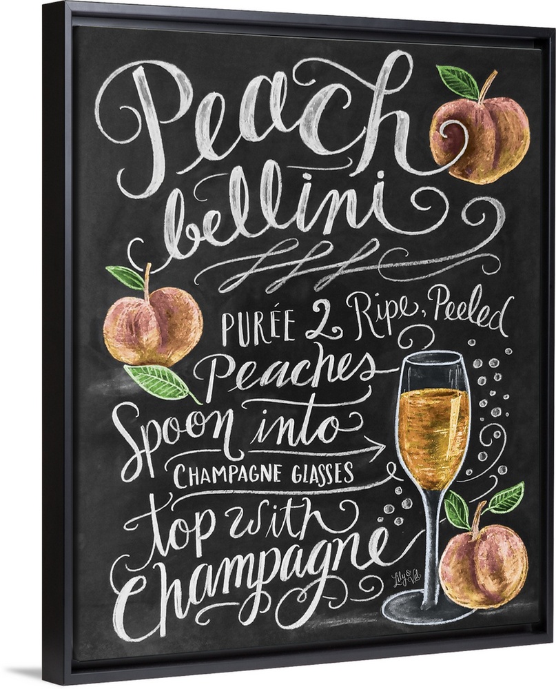 <p>Handwritten and illustrated recipe for a mixed drink, including peaches and a champagne glass.</p>
