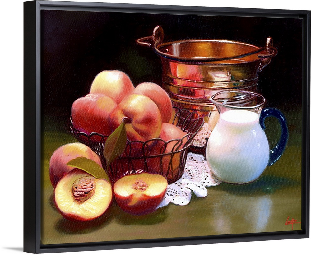 <p>Wire basket of peaches on table with peaches cut open, pitcher of cream and copper bucket.</p>