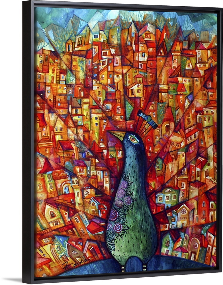 <p>Contemporary painting of a peacock with a city visible in its feathers.</p>