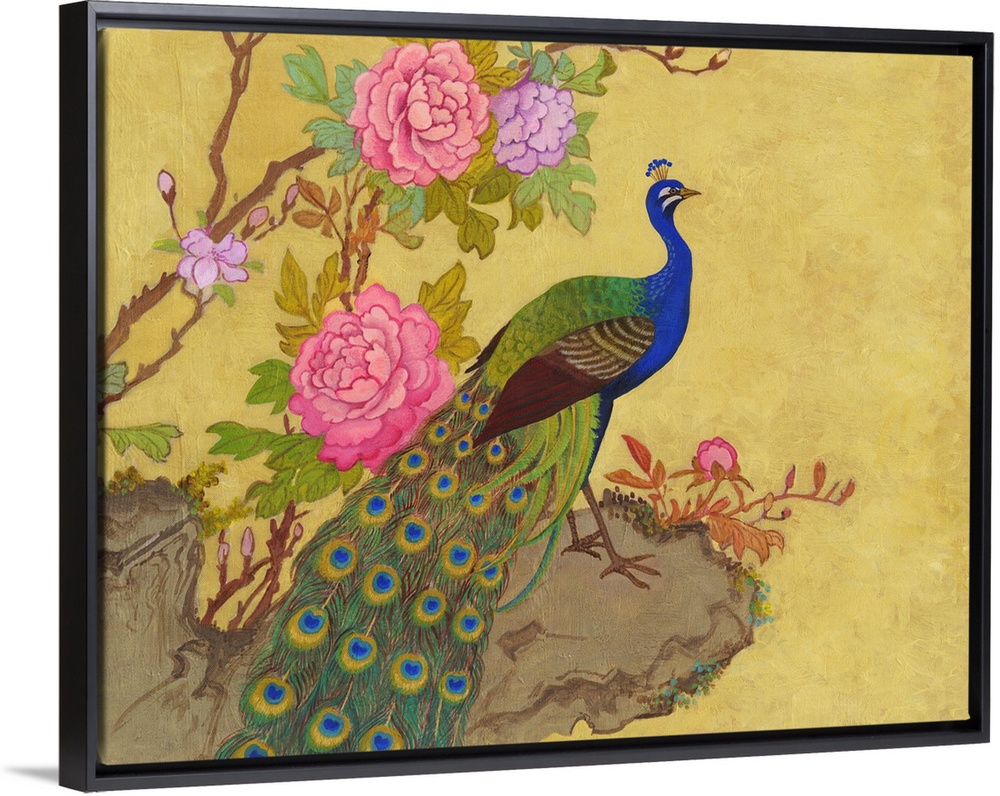 <p>Chinese style painting of a peacock standing on a ledge with pink peonies.</p>