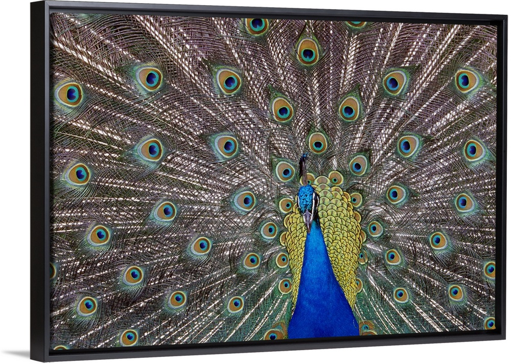 <p>Landscape, large, close up photograph of a peacock with its colorful feathers spread out.</p>