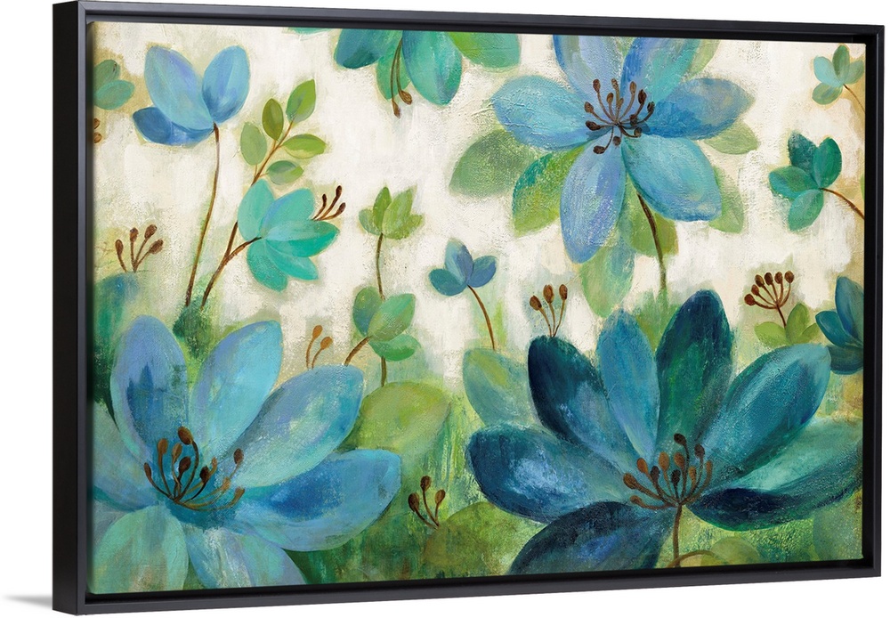 <p>Contemporary painting of blue and green flowers against a cream toned background.</p>