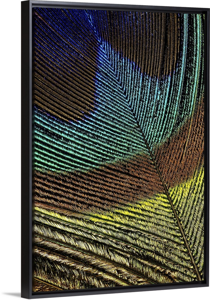 <p>Large, portrait close up photograph of the colorful tip of a peacock feather.</p>