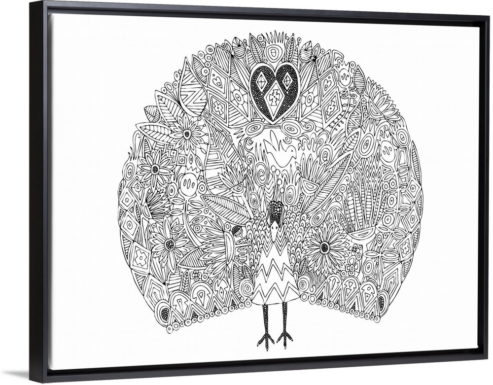 <p>Black and white line art of a peacock displaying its plumage with images inside the line work.</p>