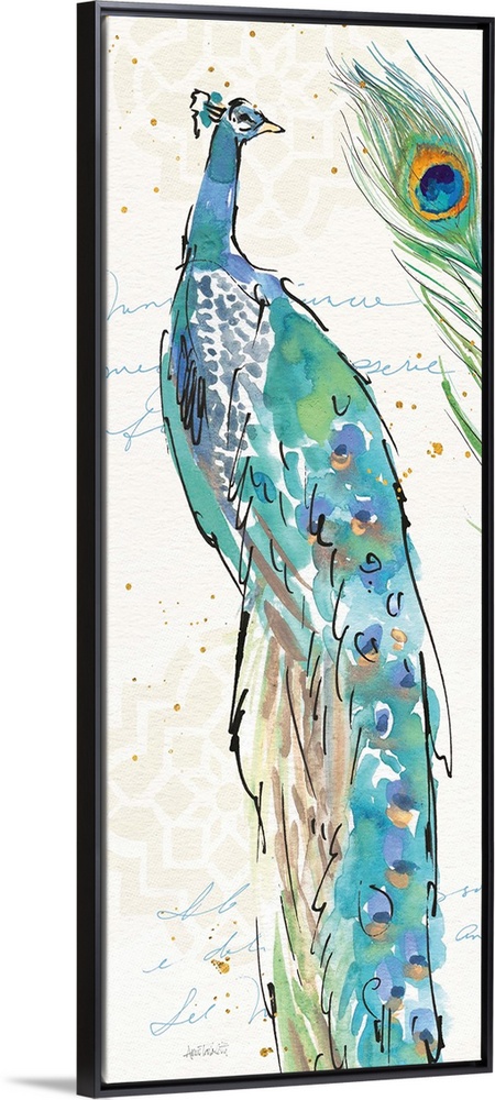 <p>Tall rectangular watercolor painting of a peacock and a peacock feathers on a neutral colored background with light beige patterns and blue handwriting.</p>
