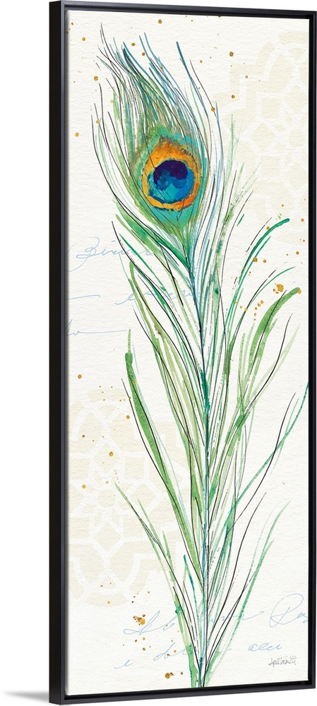 <p>Tall rectangular watercolor painting of a peacock feather on a neutral colored background with light beige patterns and blue handwriting.</p>